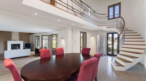This south-facing home offers 330 m² of living space and includes eight rooms, two living rooms (one of which has its own chimney), a dining room, a kitchen, a bathroom, an office, an independent studio, a storage room, a garage, and two terraces that surround an outdoor pool.