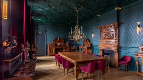 Son travail a pu même associer, par endroits, des aspects historiques à des lignes plus modernes, dans un jeu subtil d'équilibriste. Sa couleur bleue fétiche se déploie désormais dans toutes les pièces, de l'entrée aux lourdes boiseries en passant par les murs du grand salon, les meubles acajou de la cuisine et les lambris de la salle à manger. Tous les éléments sont maintenant en place afin que cette décoration se bonifie. Comme un bon vin…