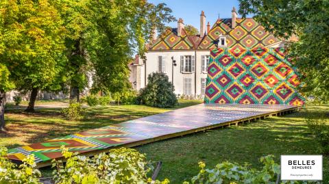 Jusqu'à fin novembre 2022, sa belle façade de style néo-classique sera partiellement recouverte d'une œuvre qui se laisse uniquement admirer derrière de hautes grilles. Celle-ci longe le gazon du parc pour se dérouler, tel un tapis de 35 mètres de long. Une masse surélevée imaginée comme un parquet hors sol, raccroché aux motifs de la toiture. L'ensemble forme ainsi un effet visuel étonnant qui dialogue avec le bâtiment.