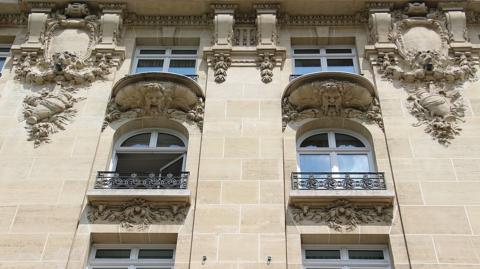 Blasons et cariatides parsèment la façade haussmannienne de l'immeuble rénové. © DR
