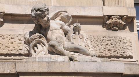 Sur la façade rénovée de l'immeuble, les blasons et les cariatides se multiplient. © DR