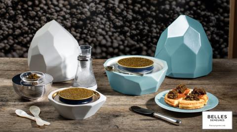 Ces fleurons français des arts de la table et du savoir-faire ouvrent le bal avec « Un Hiver Givré », dont l'ambiance hivernale, aux tons bleus glaciers et blancs, anime la collection « Rocher ». Les boîtes sont taillées comme des pierres précieuses pour présenter et dévoiler les mets les plus délicats qui jalonneront les instants de partages gourmands. Idéal pour sortir une boîte de caviar lovée dans l'écrin de son lit de glace.