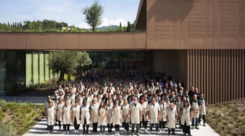 Ici, l'esthétisme architectural se conjugue avec une haute valeur environnementale. C'est sur un terrain de 14 000 m² que les 3 500 m² du complexe s'étendent horizontalement, sur un seul niveau, avec des parois transparentes pour plus de fluidité. Sous une toiture végétalisée et entouré d'une oliveraie de 700 arbres, il abrite des bureaux, un restaurant, un entrepôt de production, des ateliers et une école de haute maroquinerie.