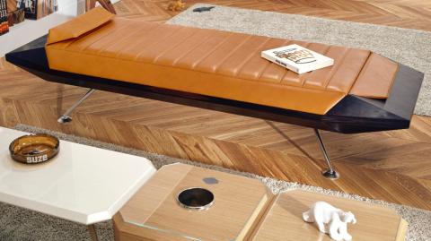 Inspirée par les concept-cars futuristes, cette pièce possède des appuis-tête rabattables à ses extrémités. © TB
