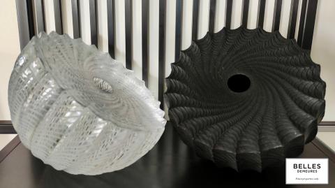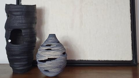Il y fait la découverte de cette matière, en version brut, directement dans la forêt, pour la faire sécher, la voir se tordre et adopter une nouvelle forme sous l’effet de ses outils. Évidée jusqu’à ce qu'elle n’ait plus qu’une très fine épaisseur et une étonnante légèreté, chaque pièce prend des lignes pures aux contours épurés, sculptée ligne par ligne en se parant de motifs géométriques, de textures contrastées et de nuances.