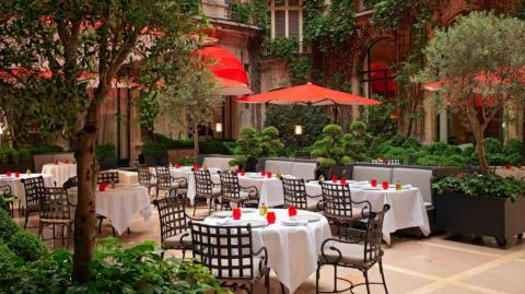Pour en faire le tour, il faudra s'y reprendre à 3 fois. En effet, 3 restaurants se partagent la cour de ce palace du Triangle d'Or. Le Cinq vante la haute gastronomie du triple étoilé Michelin, avec Christian Le Squer. Le George est le repaire de Simone Zanoni, avec une carte italienne couronnée d’un macaron au guide rouge. Également étoilée, l’Orangerie d'Alan Taudon séduit les amateurs d'assiettes végétales et de produits de la mer. Menus déjeuners respectifs : 140 €, 65 € et 75 €. www.fourseasons.com