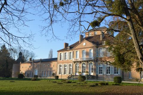 Bois, prairies, écuries aménagées, deux tours faisant office de chapelle et de pigeonnier, le bâtiment offre une surface habitable de 1 100 m². Pour rajouter au charme, un parc à l'anglaise, des arbres centenaires, des pelouses verdoyantes et un étang se marient harmonieusement dans ce cadre bucolique au silence reposant. Il n'en fallait pas plus pour qu'on s'y sente tout à fait bien.