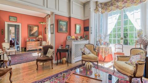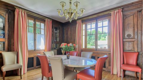 Cette villa est posée sur un terrain arboré de 690 m², avec 323 m² de superficie habitable. Elle est composée de 9 pièces, 1 réception de 50 m², 1 salle à manger ornée de boiseries anciennes, 1 cuisien dînatoire équipée, 5 chambres et 2 salles de bains.