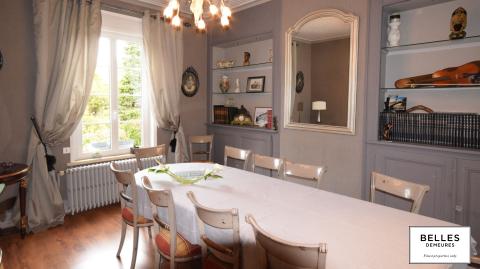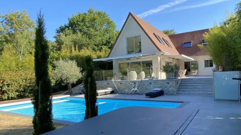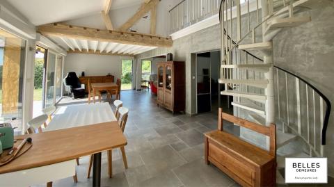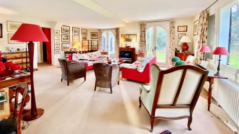 Un style qui colle à cette demeure située au cœur de la forêt, sur un jardin de 2 500 m². Sur 2 niveaux, elle dispose de 190 m² habitables, 8 pièces, un salon de 45 m², 1 salle à manger, 1 cuisine équipée, 5 chambres, 3 salle de bains et 1 terrasse orientée sud.