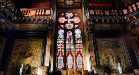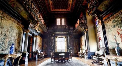 Quant à l'espace intérieur, la surface habitable compte 3 500 m² sur 5 niveaux. Il offre 91 pièces desservies par un escalier hélicoïdal, plusieurs salles voûtées, 2 cuisines, 600 m² de salons et de salles de réception, dont l’une avec des volumes impressionnants en partie éclairés par des vitraux d'origine, 1 bibliothèque dotée d’un balcon intérieur ouvragé et plus de 250 m² de chambres et d'appartements situés aux derniers étages. Le mobilier, les parquets, les plafonds peints et dorés, les dallages de marbre, les mosaïques et les éléments décoratifs du lieu méritent à eux seuls votre intérêt.