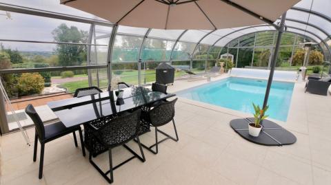 La qualité des prestations de cette demeure mérite le détour pour ses 11 300 m² de terrain paysager, dont la position dominante offre le panorama complet sur la vallée et ses 220 m² de surface habitable sur 2 niveaux. Prolongée par la terrasse d'une piscine extérieure couverte, elle compte 7 pièces, 1 salon avec plafond cathédrale et cheminée, 1 cuisine ouverte avec espace salle-à-manger, 4 chambres, 3 salles de bains, 1 bureau, 1 atelier de travail et 1 grenier. Le tout, à 30 minutes des plages…